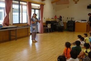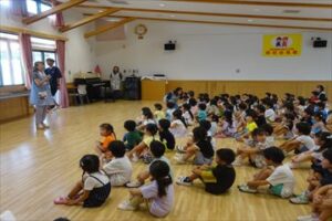 8月27日(水)、第2学期始業式を遊戯室で行いました。元気な園歌で始まり、その後、小沼園長先生からのお話を聞きました。「長い夏休みも終わり、今日から2学期が始まります。2学期はたくさんの行事があります。健康に気をつけて、暑さに負けず元気に過ごしましょう。」その後、年長さんが着用する「だんべえ踊り」の新しい法被の紹介もありました。みんな笑顔でしっかりお話を聞くことができました。
