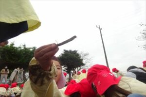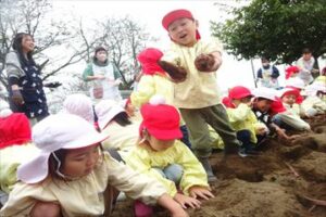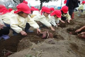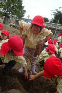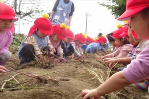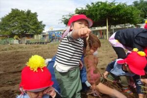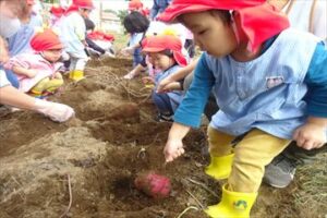 10月21日(火)に未満児、22日(水)に以上児の子どもたちがサツマイモ掘りを行いました。1日目はひよこ組やあひる組の小さなおともだちが見守る中、ぺんぎん組さんが土を触る感触を楽しんだり、大きなお芋がとれた面白さを味わったりしました。2日目は、まず年中組さん、その後、年長組さんが年少組の子たちにの面倒を見ながら、協力して楽しくお芋を収穫しました。自分たちで植えたサツマイモの生長を感じながら収穫の喜びを味わい、それとともに、土の匂い、感触などにも興味関心を持ちました。収穫したサツマイモは、なんと91Kg!大収穫となりました。後日、皆で茹でて食す予定です。