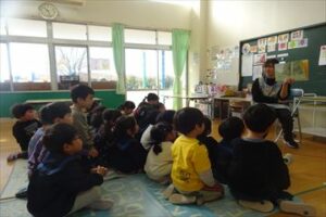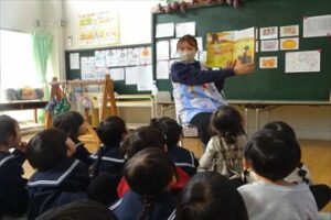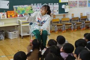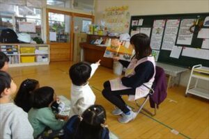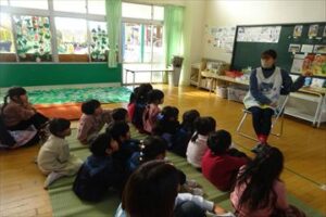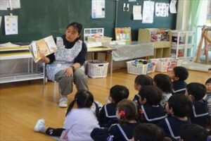 11月19日(水)、以上児の絵本タイムを実施しました。子どもたちが、一番興味のある絵本のクラスを自ら選び、参加します。幼児期の絵本は感性を育てます。教師が読み聞かせを行っている間、子どもたちの頭の中は物語の主人公になりきっているようです。。本園では、教師が絵本・紙芝居を吟味し、内容をわかり易く伝え感性に訴えかけています。