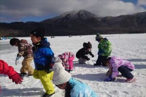 1月16日(金)に年長の子どもたちによる雪遊びを赤城山で実施しました。ソリに乗ったり、雪合戦をしたり、大沼の氷の上を歩いたりと、思う存分楽しみました。晴れ渡った青空の下、赤城山の自然の雄大さを肌で感じる貴重な体験となりました。またお昼のカレーも大好評で完食でした。役員の方には、様々な面で大変お世話になりました。ありがとうございました。