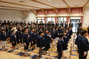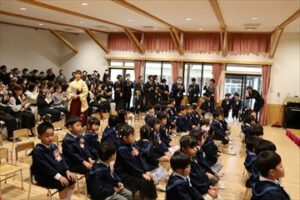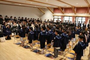 3月18日(水)、河津桜の咲き誇る中、令和7年度第55回修了証書授与式が遊戯室で挙行されました。園児58名が卒園式に臨み、園歌を大きな声で歌い、「お別れのことば」も声をそろえ気持ちも一つに、堂々と伝えることができました。今年度、交友会より、卒園記念品として「長縄付ポールスタンド、竹馬、ホッピング等」が寄贈されました。