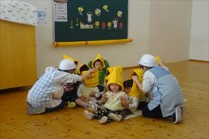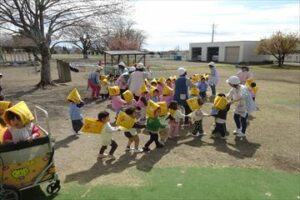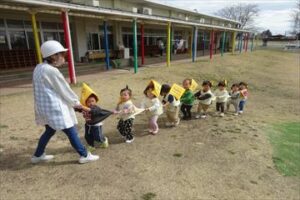 3月19日(木)に、未満児(ひよこ、あひる、ぺんぎん、ぱんだ組)の避難訓練を実施しました。給食室から出火を想定し、担任の指示に従い、防災頭巾を被って南園庭へ避難しました。今年度最後の訓練ということもあり、泣く子もなく、しっかりと訓練に参加できました。